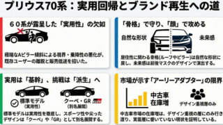 査定君プリウスは長年、ハイブリッドの象徴として合理性と未来感を両立してきました。しかし60系での極端なデザイン変更により、居住性や乗降性、視界など基幹車としての安心感が揺らぎ、販売低迷という現象が起こりました。70系の開発に向けて、どの方向...