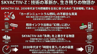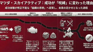 査定君「マツダの黒歴史は何か」と問われたとき、多くの人はロータリーエンジン、販売不振や欧州撤退、電動化の遅れを思い浮かべるだろう。しかし本質は、もっと手前にある。それがスカイアクティブという成功体験が、修正不能な思想へと変質したことだ。本稿...