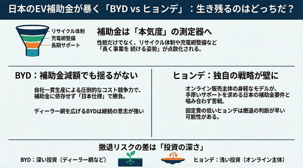 Hyundaiについては、BYDと比べると撤退リスクは相対的に高いと評価せざるを得ません。これは企業体力や技術力の問題ではなく、日本市場における事業構造の特性によるものです。