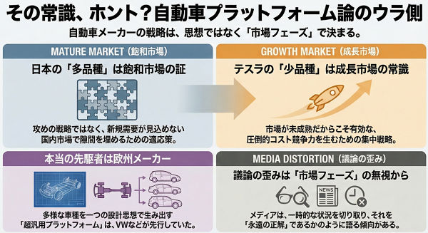 「なぜ自動車プラットフォーム論は歪んで語られやすいのか」、少量多品種生産とテスラを比較し、必ず日本優位論としてしまう、メディアの違和感という視点から整理します。