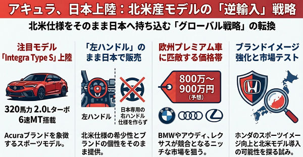ホンダが北米産モデルを左ハンドルのまま日本に導入するという試みは、日本市場では珍しいアプローチです。Integra Type Sは魅力的なスポーツモデルですが、価格帯やブランドポジションを考えると欧州プレミアムスポーツとの競争は避けられません。