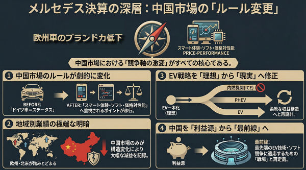 2025年のメルセデス決算は確かに厳しい数字でした。しかしそれは「競争力崩壊」ではありません。