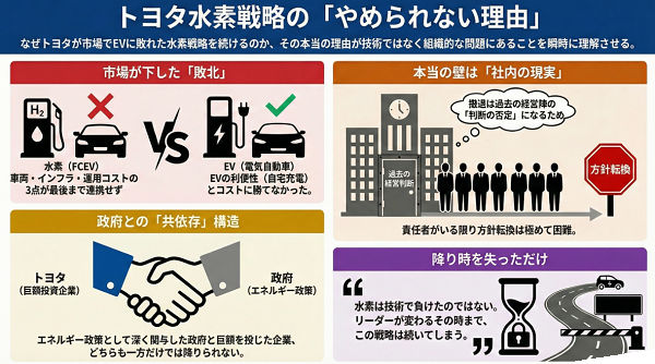 EVが事実上勝利した現在でも、なぜトヨタは水素(FCEV)を続けるのか。普及しなかった理由、大型車転用の限界、クラウンFCEVの意味、社内構造と撤退できない現実を整理する。