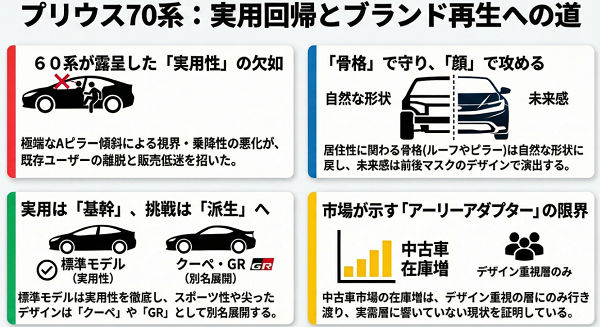 60系の問題を踏まえ、70系は「基幹車としての安心感」を軸にデザインやパッケージを整理する必要があります。